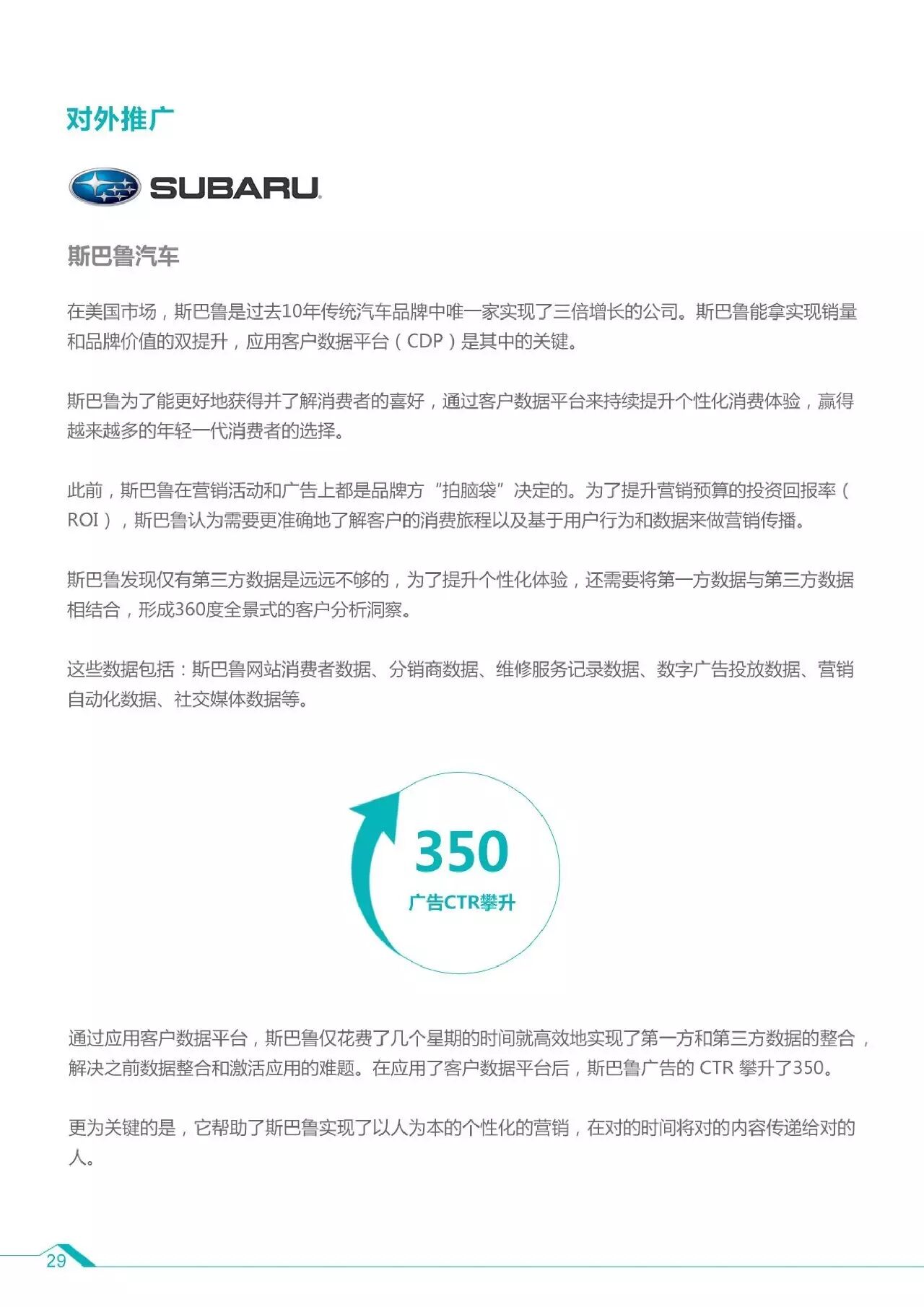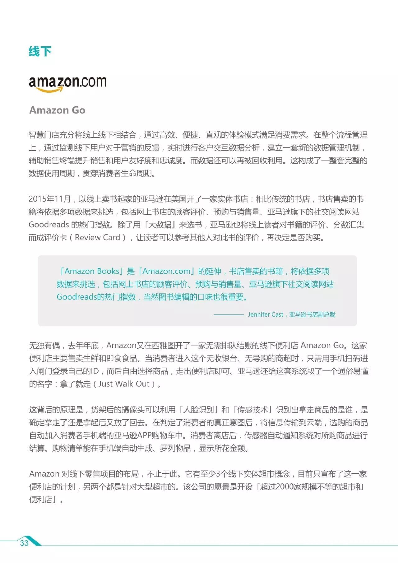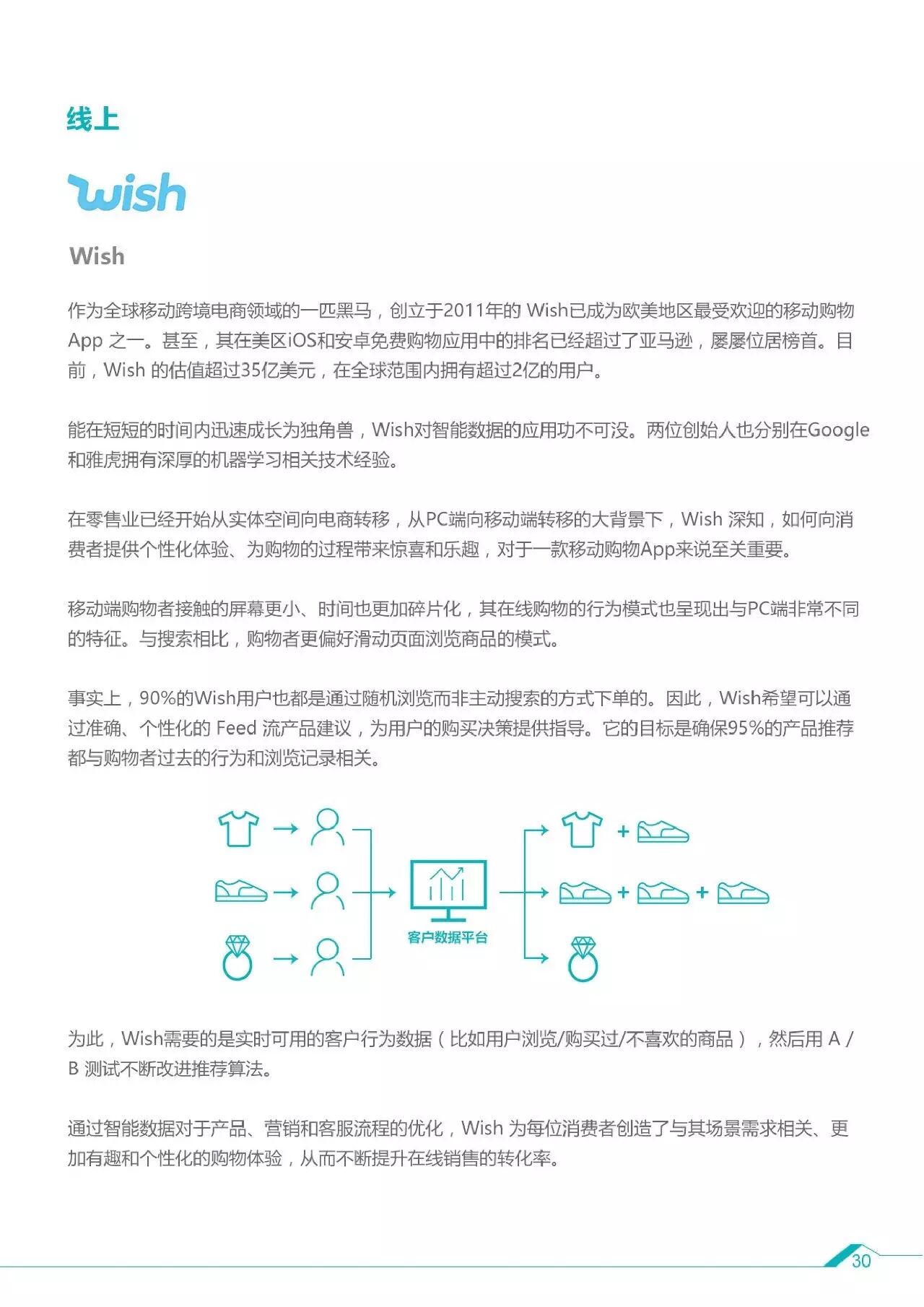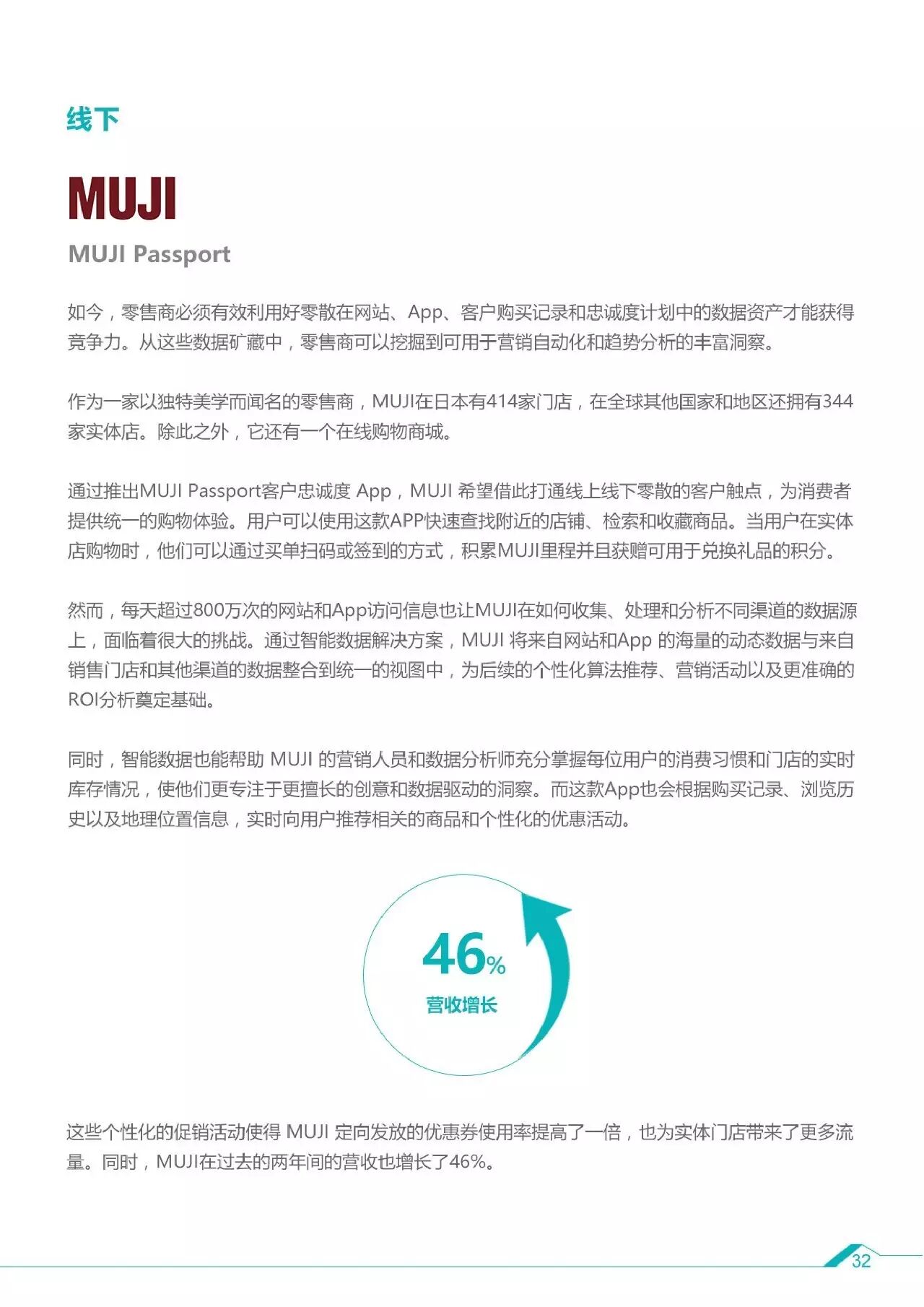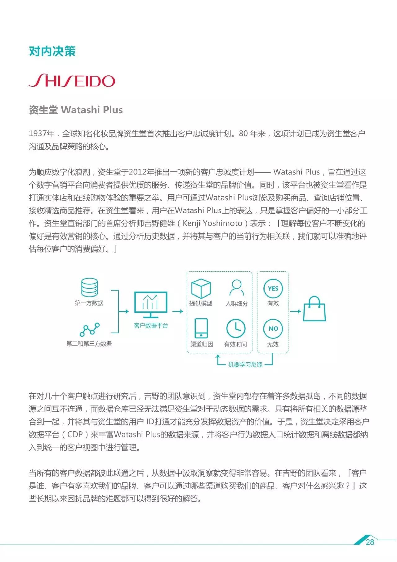 5、智能数据的应用场景及案例:对内决策(可口可乐、资生堂)、对外推广(斯巴鲁)、线上(Wish、荷兰皇家航空)、线下(MUJI、亚马逊GO)。