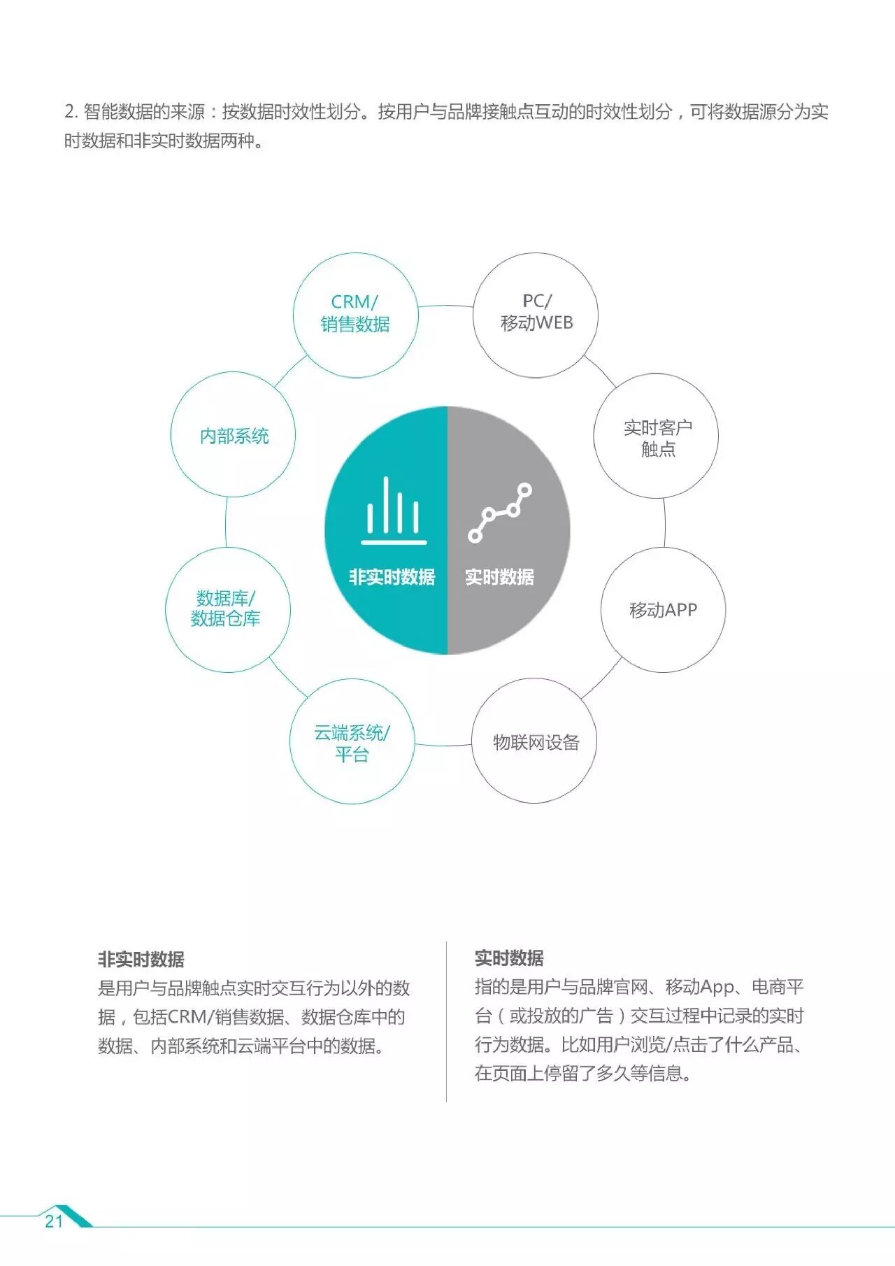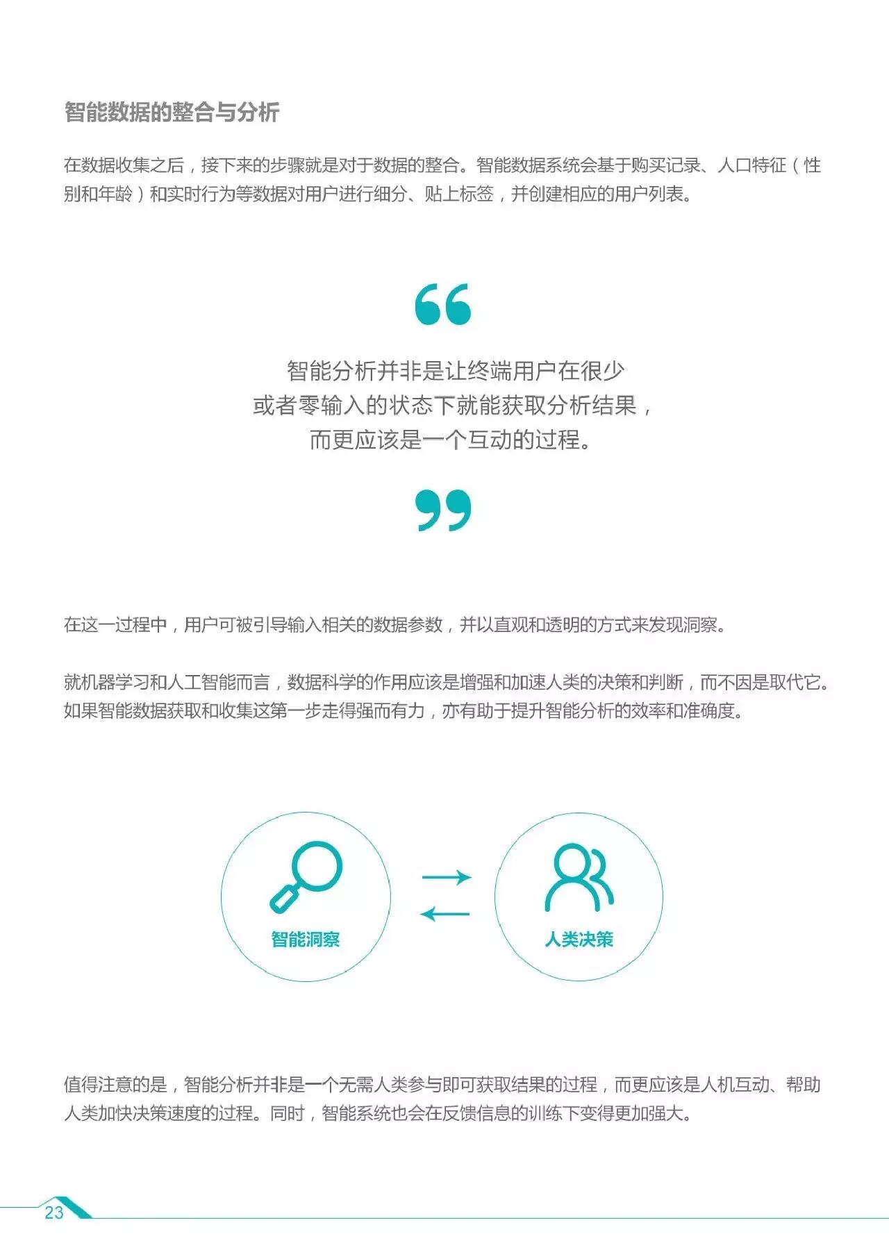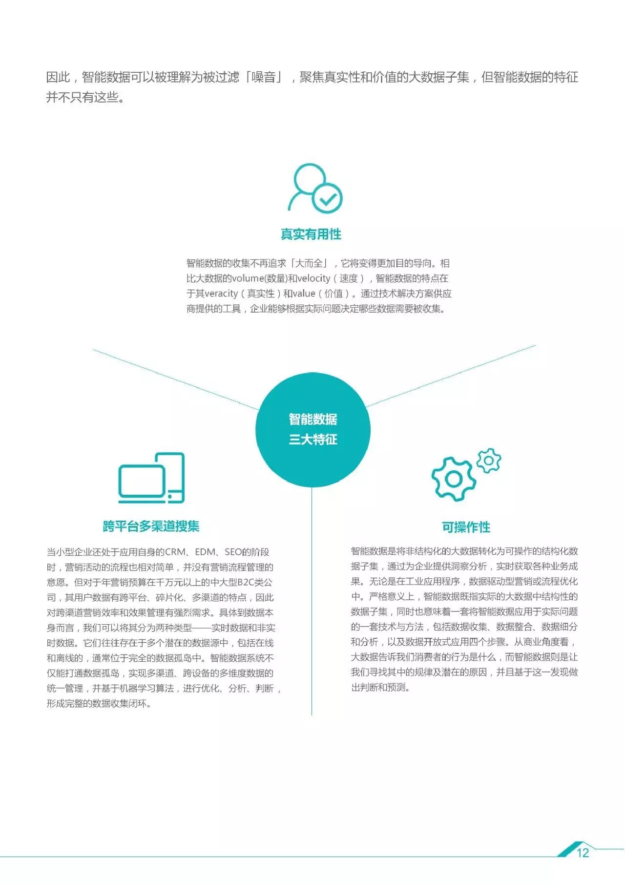 3、智能数据关乎5个核心问题:数量、速度、多样性、真实性和价值。智能数据的三大特征是真实有用性,不追求大而全,根据实际问题决定采用哪些数据;跨平台多渠道搜集,打通数据孤岛,实现多渠道跨设备的统一管理,基于机器学习进行优化、分析、判断,形成闭环;可操作性,智能数据让我们在知道消费者行为后,找到其中的规律和潜在原因,基于这一发现做出判断和预测。