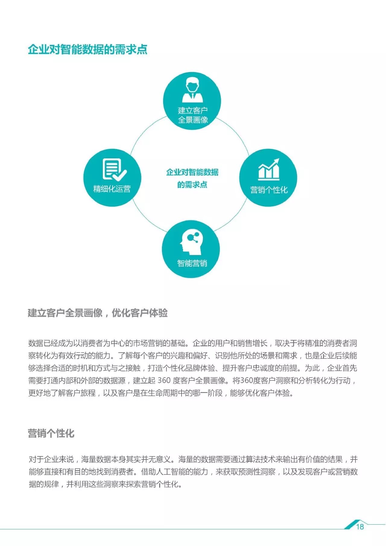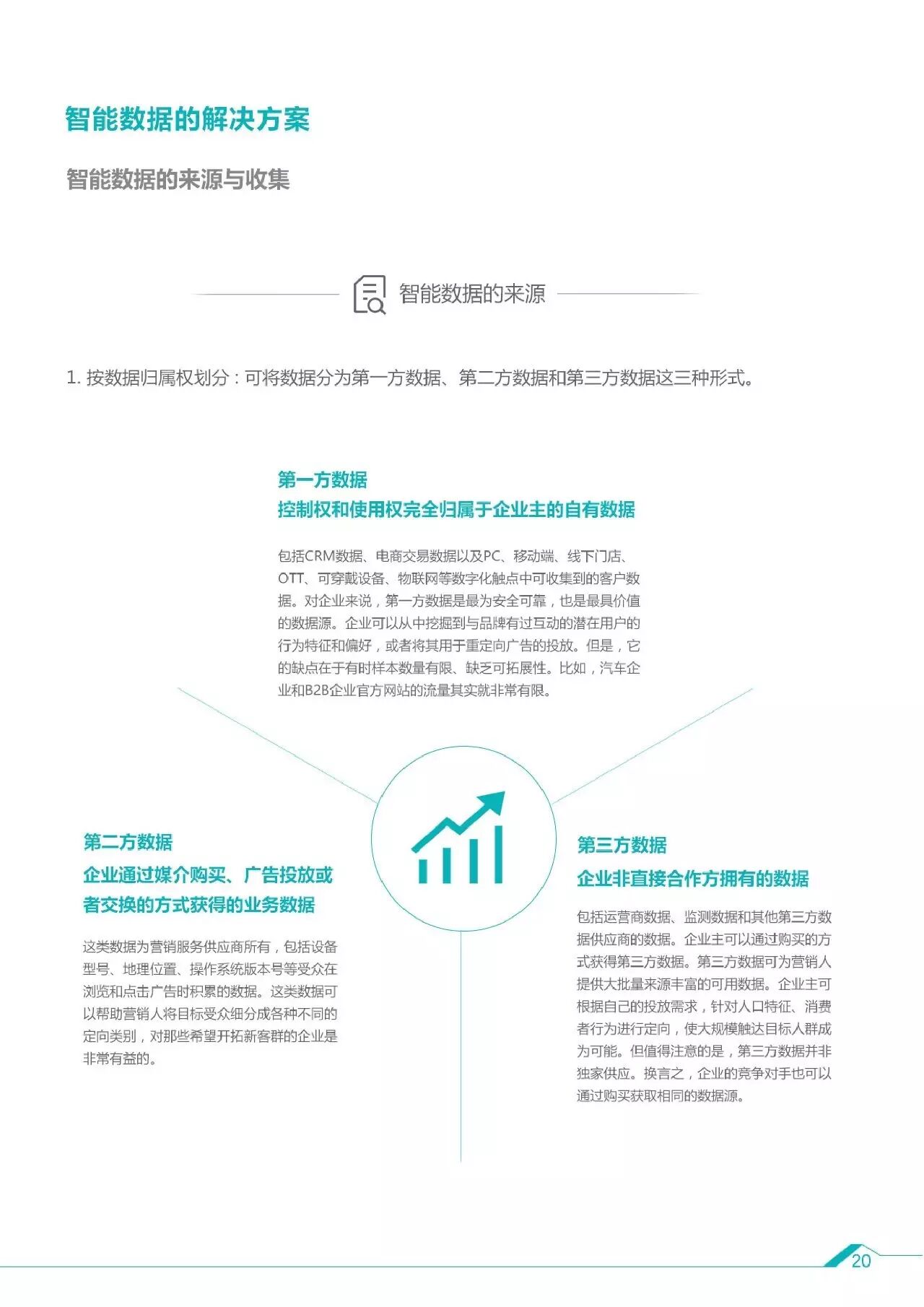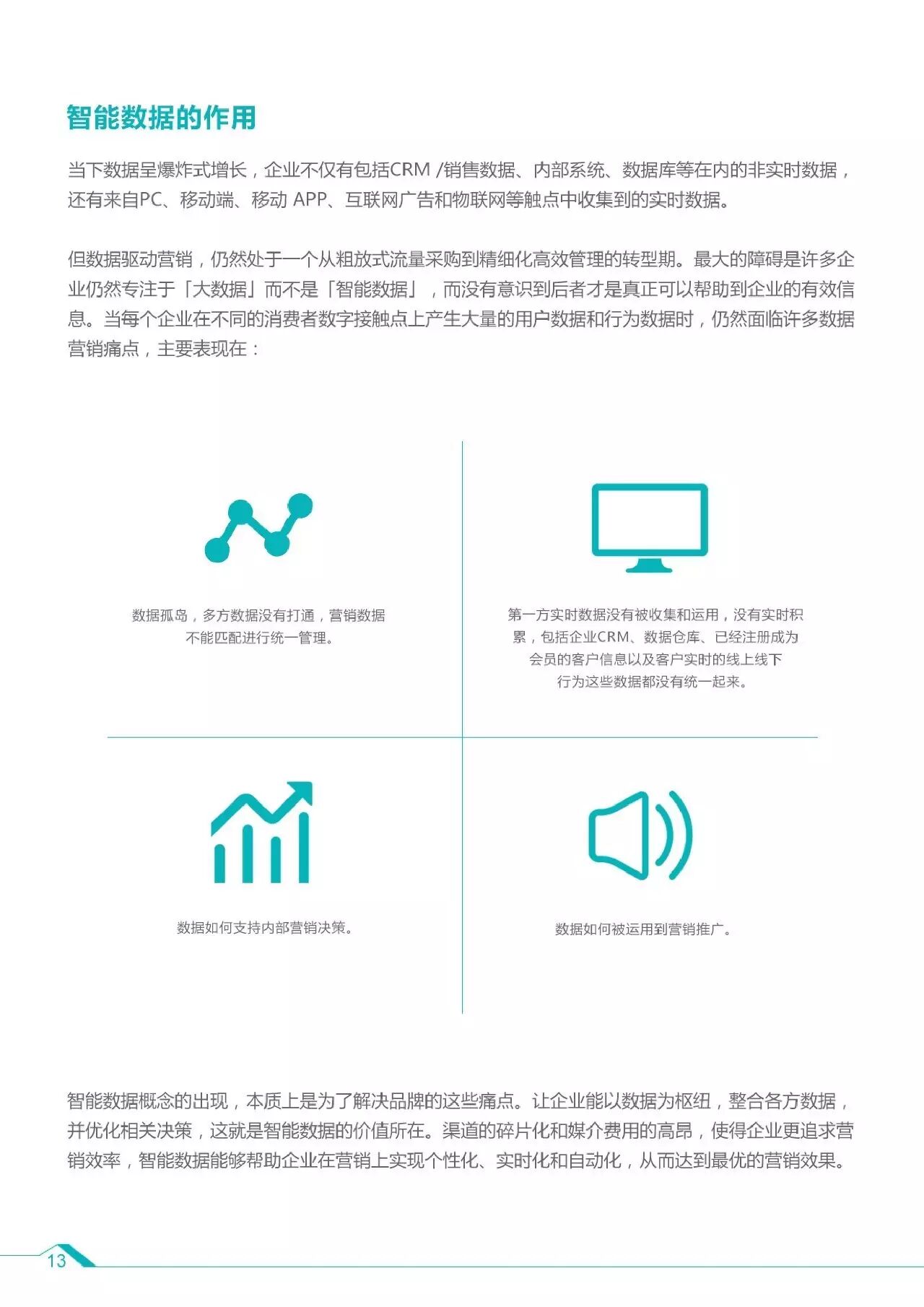 1、智能数据是能够解决实际问题的大数据的子集,随着数据与技术驱动营销的效用凸显,企业和代理商需要一站式的解决方案,从数据收集、分析到数据利用都能够统一管理,不仅用于广告投放和营销,更可以利用在商业决策乃至其他企业级需求。