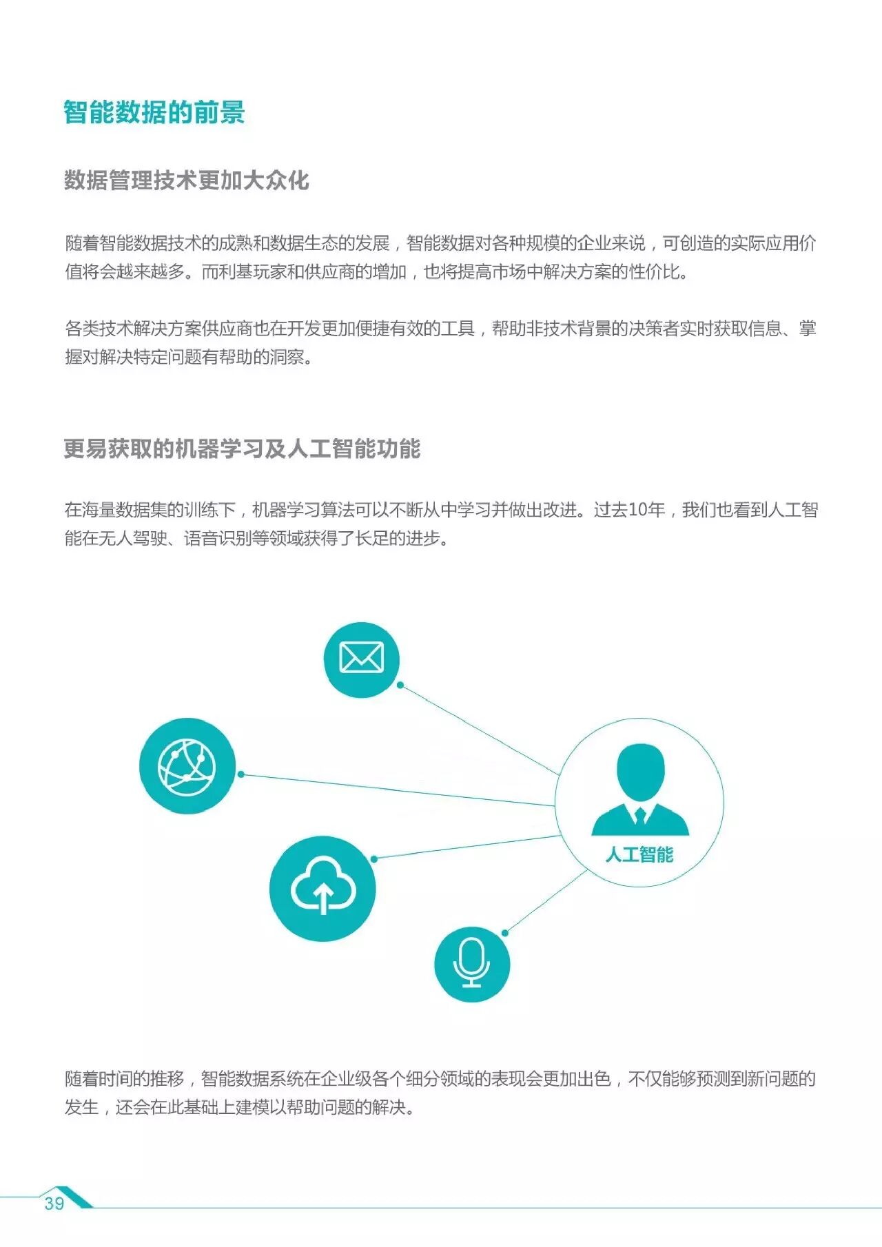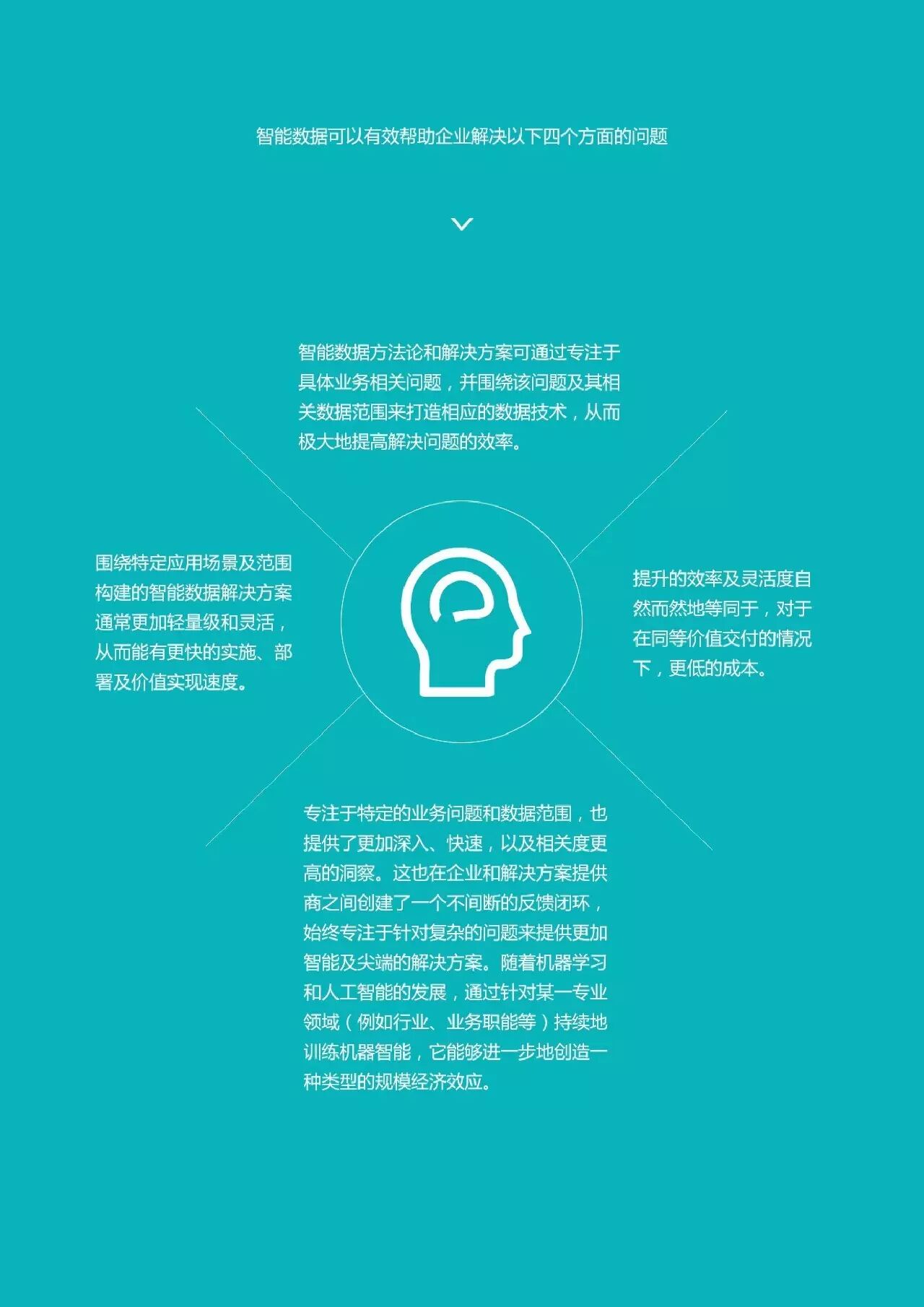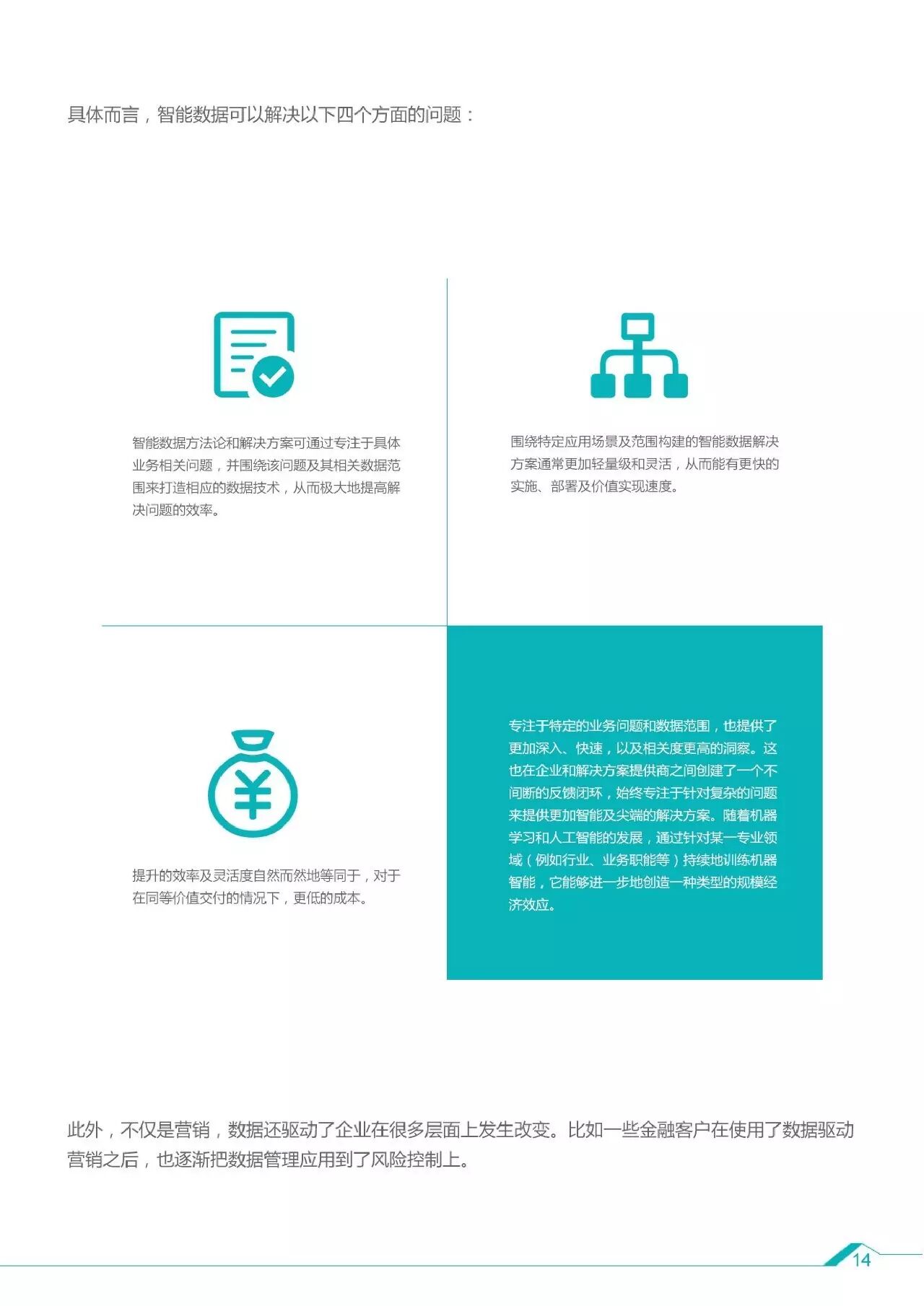 4、智能数据解决的4个问题:提高解决问题的效率;围绕特定场景构建解决方案;同等价值更低的成本;创造规模化的经济效应