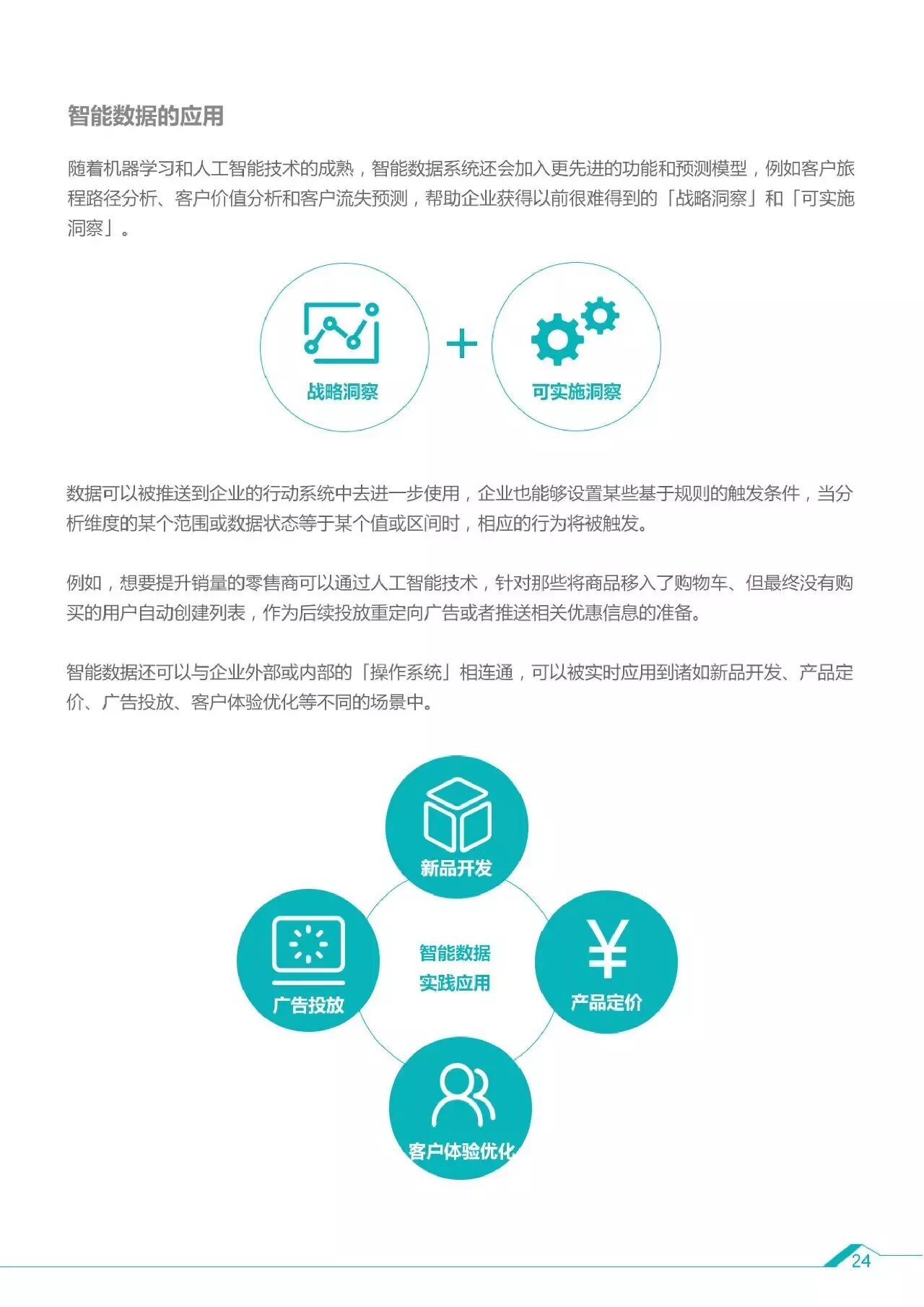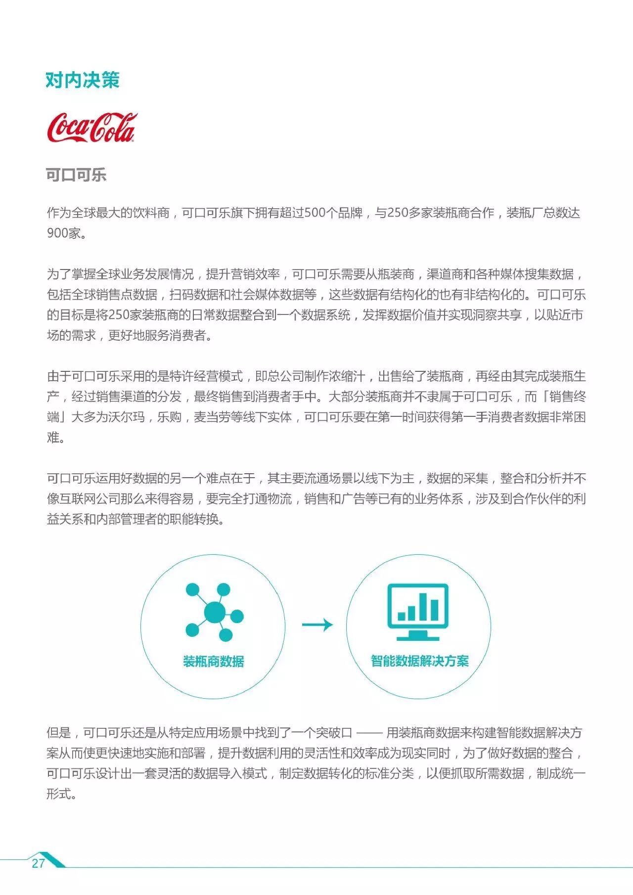 在智能数据的运用上,企业所面临的难题包括:数据收集,整合分析以及实现数据应用的闭环,许多国际公司已经开始从多个方面进行智能数据的实践,包括亚马逊、可口可乐、荷兰航空等公司纷纷将智能数据应用在了对内决策、对外的数据驱动营销以及客户体验提升和优化等方面。