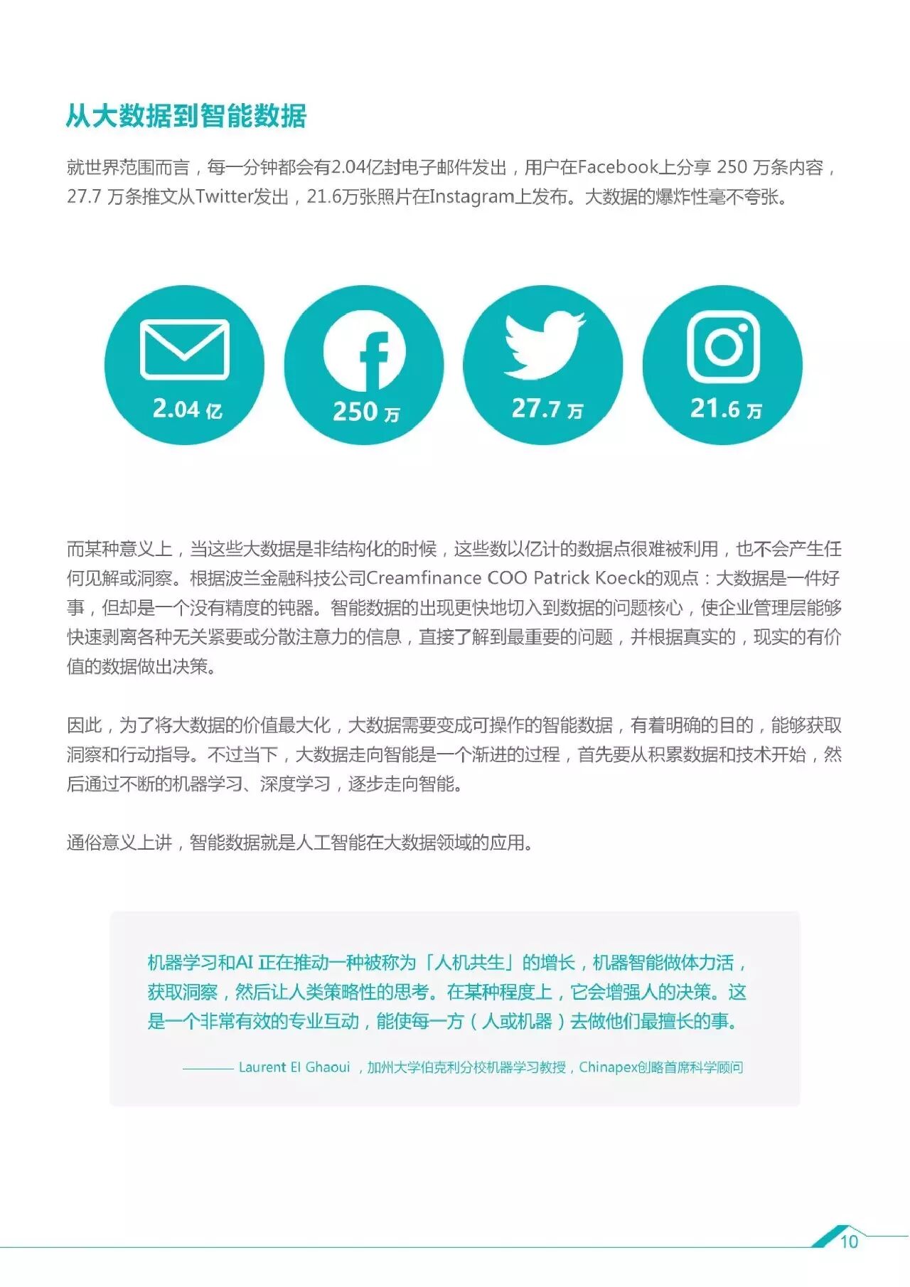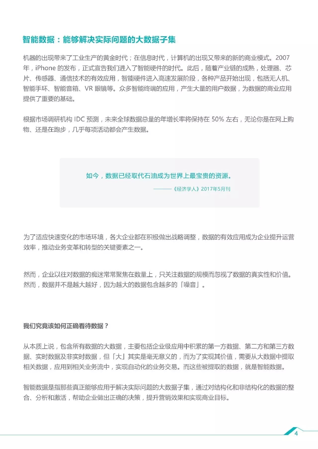 对比庞大的数据总量,真正能够解决实际问题的大数据——智能数据,则需要将“原料”进行精细化的处理,这对于企业来说更有价值。