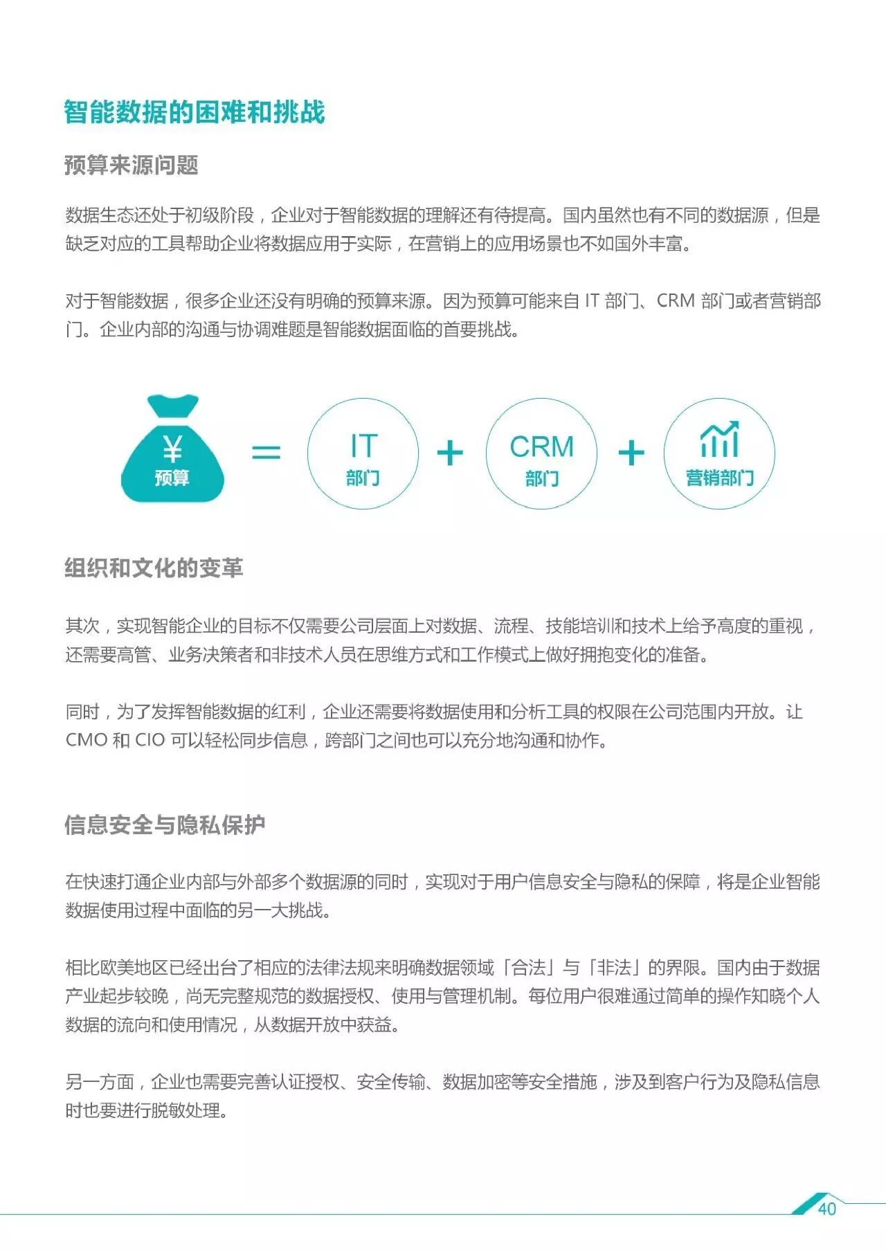 6、智能数据遇到的挑战:预算来源问题;组织和文化的变革;信息安全与隐私的保护;