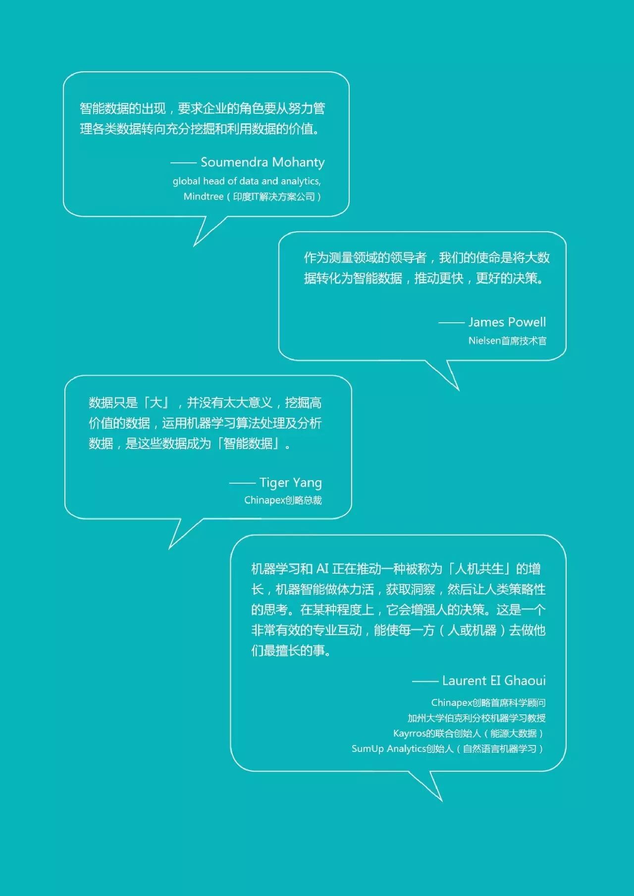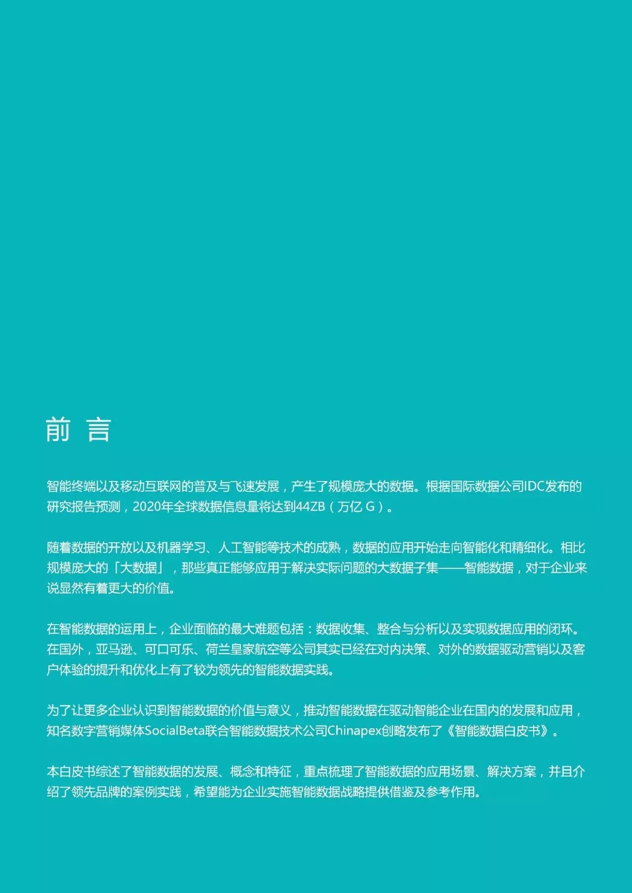 【摘要】智能数据技术公司chinapex发布了《智能数据白皮书》。介绍智能数据的发展、概念和特征,并介绍了智能数据的应用场景、解决方案和实践案例。