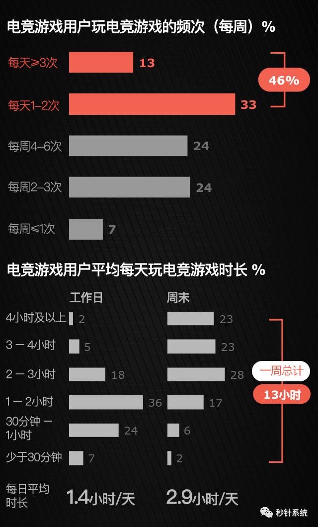电竞游戏用户日常玩电竞游戏的频次、时长均很高,游戏粘性强。他们平均每周玩电竞游戏 8.0 次,平均游戏时长达到 13 小时/周,接近半数用户每天玩游戏超过 1 次。