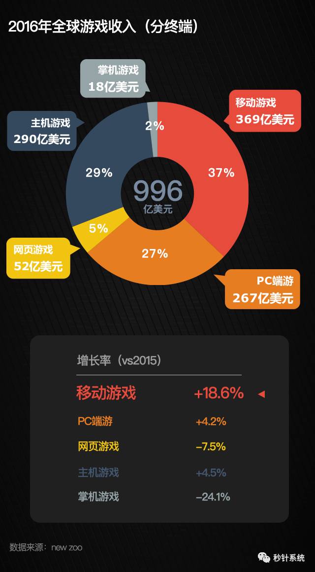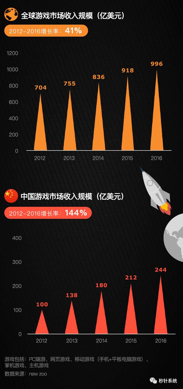 从数据上看,2016 年,全球游戏市场收入为 996 亿美元,中国游戏市场收入为 244 亿美元。这其中,移动游戏收入占比最高,过去 5 年,中国移动游戏市场收入翻了近 10 倍,增长率高达 809%。