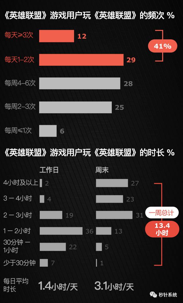 以《英雄联盟》为代表的 PC 端 MOBA 类游戏,同样有着较高的粘性,用户平均每天玩《英雄联盟》超过 1 次,且游戏时间较长,尤其是在周末。