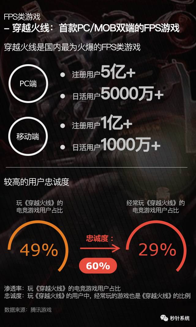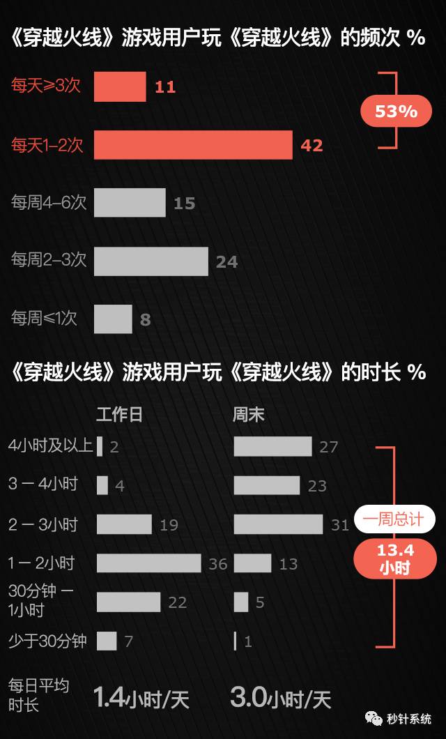 以《穿越火线》为代表的 PC/MOB 双端的 FPS 类游戏,用户平均每周玩 8.1 次,平均每周在线游戏时长达到 13 小时。