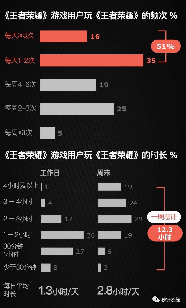以《王者荣耀》为代表的移动端 MOBA 类游戏,有着极高的渗透率,46% 的用户经常玩,忠诚度高达 74%。从具体数据上看,用户在《王者荣耀》上的粘性很强,每周玩的频次和时长数据都很可观。