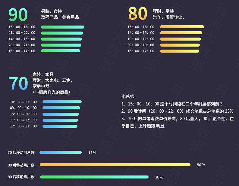 比如70后,PC购物的数量比移动购物多。90后更喜欢移动购物。80后则是现在整个消费市场的主力军。
