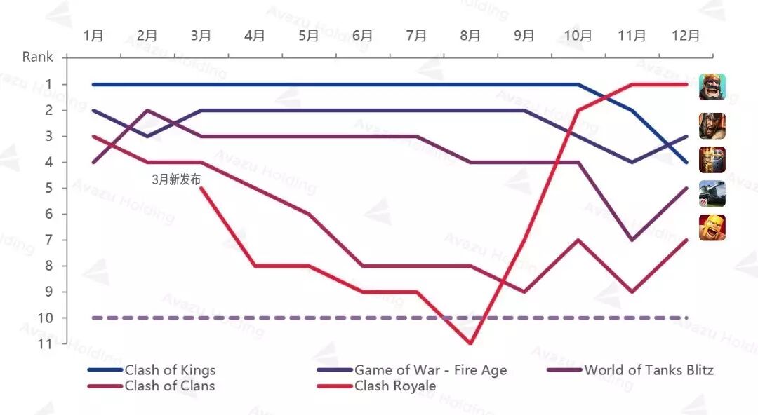 与其他欧洲国家相比,在俄罗斯,《战争游戏:火力时代》比《部落战争》《皇室战争》的玩家认可度更高,《战争游戏:火力时代》凭借全年基本老二的位置成为俄罗斯2016年收入亚军游戏,而《部落战争》在榜单TOP10中呈现逐渐下降趋势,《皇室战争》更是在发布之后数月便跌破TOP10,不过该游戏在破10后也迅速发力,急速反弹一举超过前面众游戏问鼎了11、12月收入冠军,预计未来也会是非常好的走势。