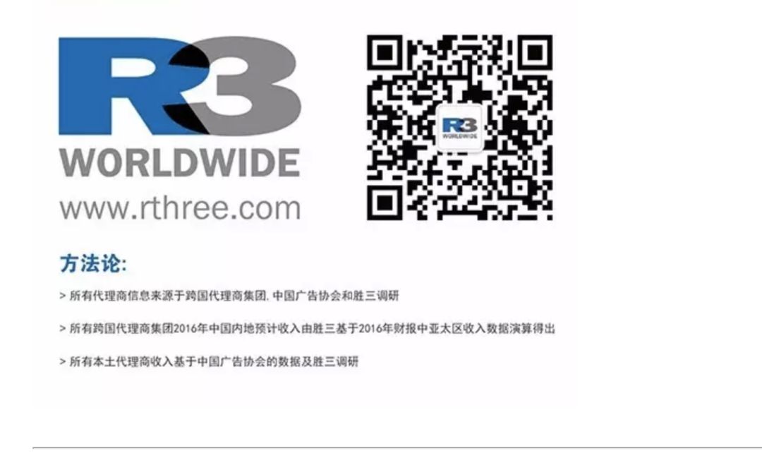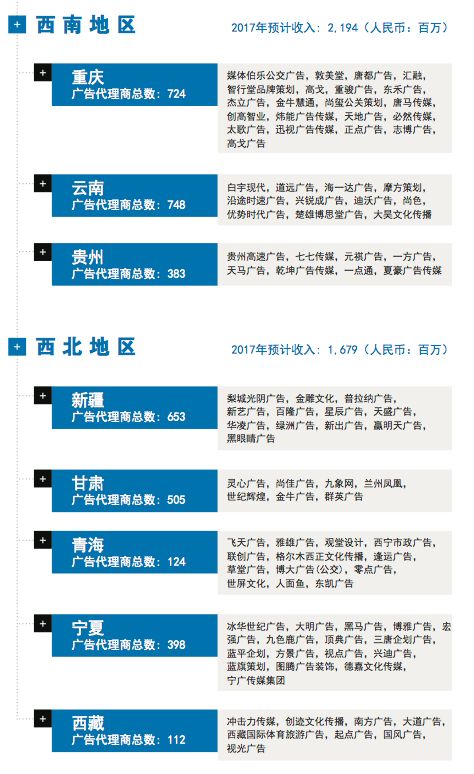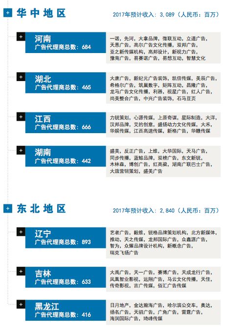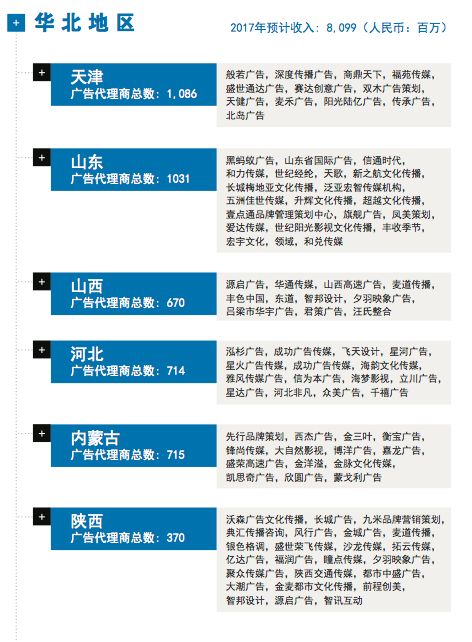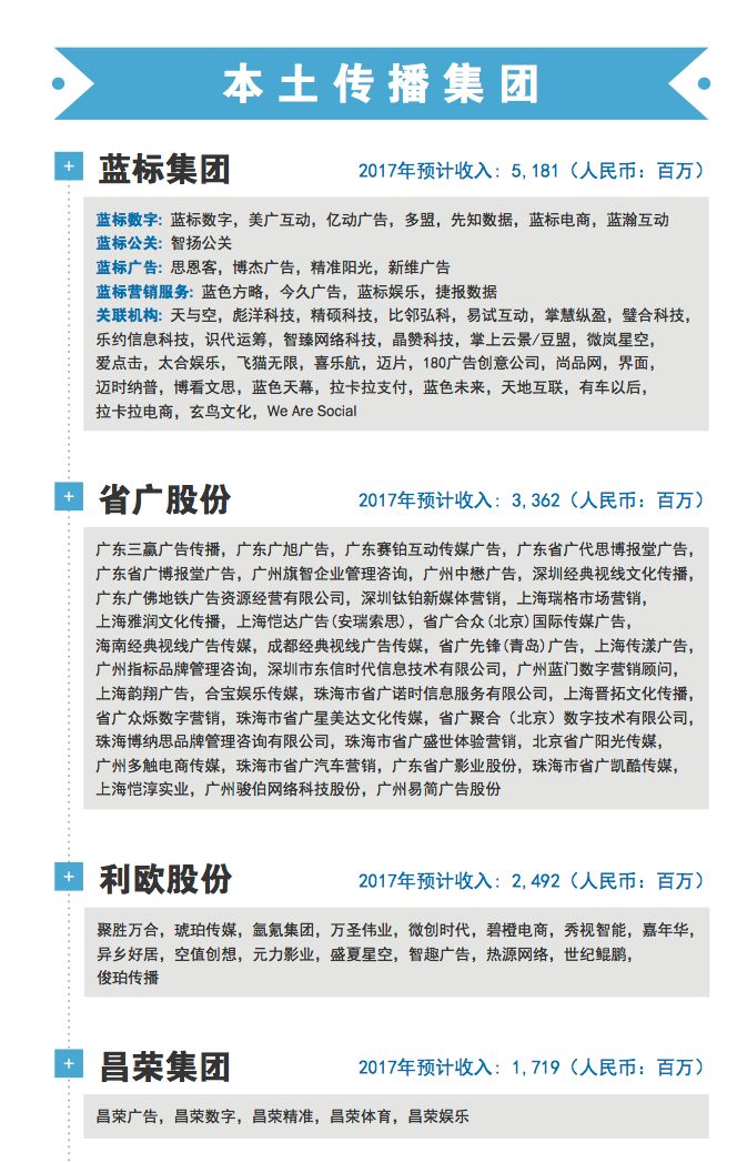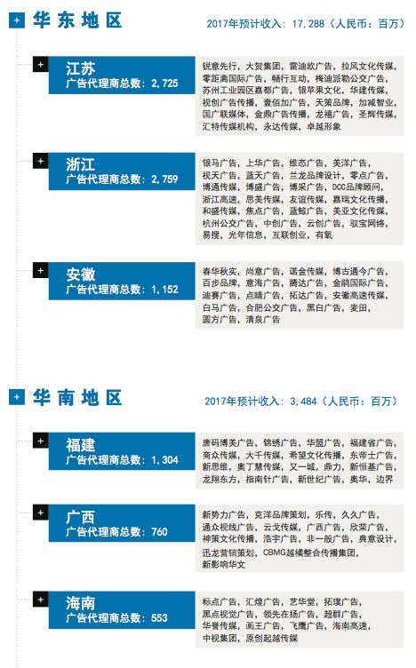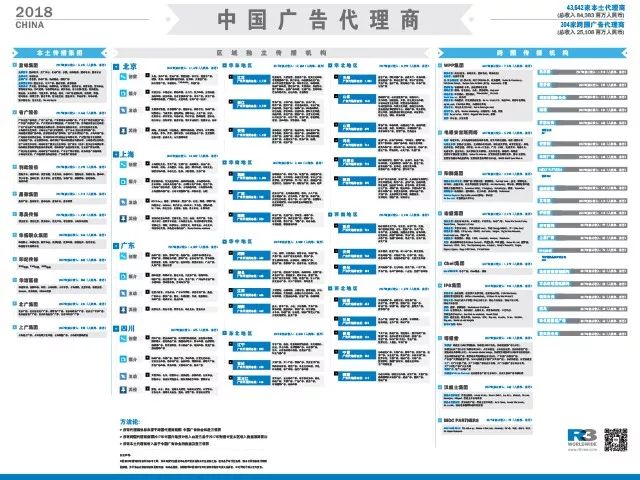独立营销咨询公司胜三发布《2018 中国广告代理商》报告。报告显示目前中国拥有 43,642 家本土代理商和 304 家跨国广告代理商,总收入分别为 84,383 百万人民币和 25,108 百万人民币。报告根据本土传播集团、区域独立传播机构、跨国传播机构划分为三个板块。