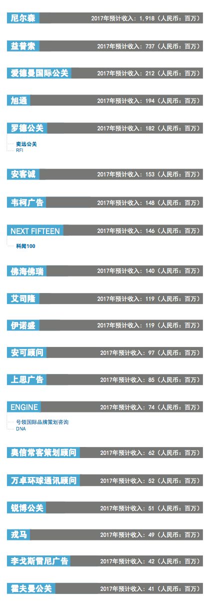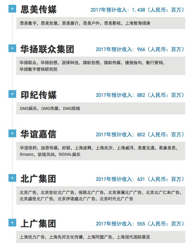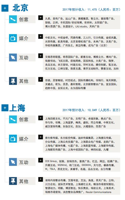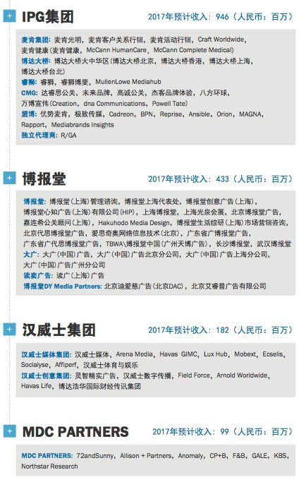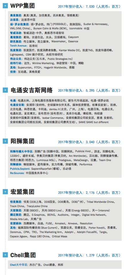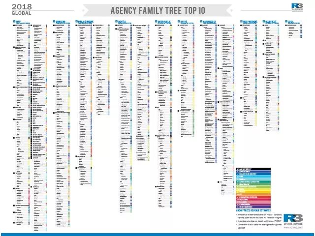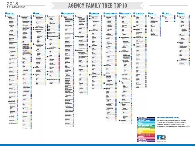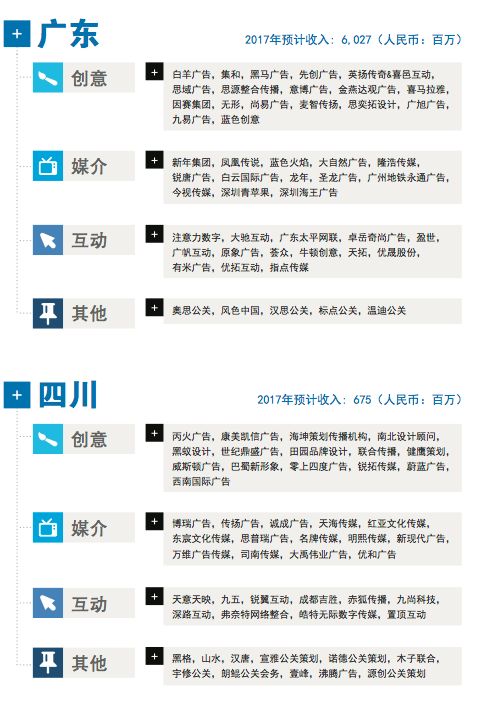 独立营销咨询公司胜三发布《2018 中国广告代理商》报告。报告显示目前中国拥有 43,642 家本土代理商和 304 家跨国广告代理商,总收入分别为 84,383 百万人民币和 25,108 百万人民币。报告根据本土传播集团、区域独立传播机构、跨国传播机构划分为三个板块。
