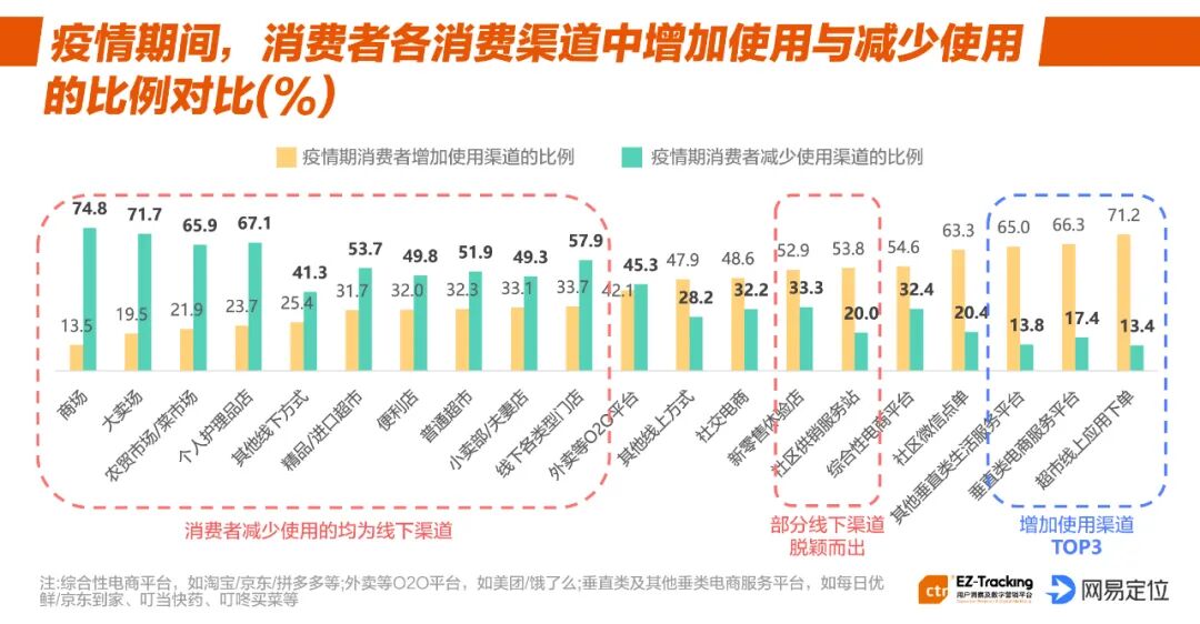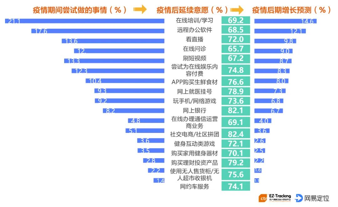 根据近期英国《金融时报》发布的数据显示,自2020年春节期间开始,中国经济下滑趋势明显,经济指数在60上下浮动,相对于2019年差距明显。疫情对经济的影响程度在广告市场亦有直接体现。eMarketer预计疫情将导致全球广告支出缩减203亿美元。值得注意的是,在2019年第三季度的预测中,eMarketer预计今年中国的媒体广告总支出将增长10.5%,达到1211.3亿美元。现在增长率降至8.4%,总额为1136.7亿美元。这是自2011年开始跟踪中国广告支出以来的最低增速。然而,疫情之下,牵动广告市场改变的不仅有宏观经济的波动,在大环境的动荡、危机之下,消费者开始尝试并可能接受了新的生活方式,这其中所产生的心理变化和新行为习惯,都将激发企业变革和转型,催生新的商业营销形态出现。我们收集了多个来源的数据,挑选了最新的一些调研,总结了十个变化。因疫情防控,居家少出门,在较长时间状态下,用户已习惯足不出户或减少外出,主动尝试并接受了云端生活、娱乐、办公等生活方式。疫情之下,消费者生活场景发生重构,由原本线上线下多元结合的生活场景迁移为线上单一场景。1.CTR数据显示,在疫情期间,79.9%消费者通过移动互联网获取信息。2.QuestMobile数据显示,从1月23日开始,全网用户每日使用总时长节节攀升,从原来的50亿小时,一路飙涨到61.1亿小时(2月3日,在家办公第一天)。各领域时长也发生了变化,视频、游戏两大领域占比上涨至38%,新闻资讯也上涨至9%。3.CTR数据显示,疫情期间,消费者转变为线上购物,超市线上应用下单、垂直类电商平台、社区微信点单在疫情期领衔线上渠道使用增长,减少使用的均为线下渠道。4.淘榜单数据显示,在整体消费低迷的2月,淘宝直播“云生活”的用户增长了153%,淘宝直播成交金额同比翻倍,用户云逛街体验感觉还不错。长期来看,疫情促使消费者重新思考生活,重建生活结构,调整节奏,为此增加了新的生活计划,将拉动部分行业出现增长。这对于新品牌、产品品类来讲是进入市场的机会,同时,这也意味着未来消费端的需求将激增,会倒逼产品、企业的快速更新迭代和创新,具有高灵敏度、高创新的品牌将占得新机。5.CTR数据显示,有73.5%的用户在疫情期间有新尝试。6.疫情之下,消费者愿意接受尝试新鲜事物。比如,在疫情期间用户对于在线培训、学习与远程办公的尝试最多,且疫后延续性较大,占比为69.2%。7.消费者在经历疫情后会产生新的生活计划,大健康意识觉醒,激发26.8%的消费者萌生购买健康保险计划。人们长期居家生活,很多家庭场景的需求被释放或刺激出来,这些新的需求改变了用户的购物车,也改变了消费市场格局。疫后,用户恐将延续疫情期间消费习惯,以居家生活为主,补偿性报复性消费示弱,理性消费或成消费潮流。8.根据国家统计局3月发布数据显示,1-2月份,全国网上零售额13712亿元,同比下降3.0%。其中,实物商品网上零售额11233亿元,增长3.0%,占社会消费品零售总额的比重为21.5%。9.国家统计局数据显示,1-2月在实物商品网上零售额中,吃类和用类商品分别增长26.4%和7.5%,穿类商品下降18.1%。10.CTR数据显示,疫情期间,线下渠道使用率整体下降,但社区供销服务站及新零售体验店逆势上涨,社区服务增加比例达到53.8%。疫情过后,消费者在生活服务型消费支出方面整体较低,仅健身房消费意愿凸显,消费需求增加。疫情改变了用户消费习惯的变化,那在不同行业是否有体现?我们以四大行业——食品、个护美妆、汽车、互联网行业为例,看下行业表现:疫情期间,对春节消费较为集中,具有季节性特点的品类或行业影响较大,对生活必需食品粮米油面、速冻食品、鲜奶、快餐品等需求保持高位。根据国家统计局数据显示,1-2月粮油、食品同比增长9.7%。国家统计局数据显示,1-2月化妆品类同比增长-14.1%,消费者使用彩妆需求和频率在短期之内大幅下降,包括唇膏、粉底液、隔离、防晒等。不过从淘榜单数据显示,眼部彩妆单品更受欢迎,同时个护基础需求保持稳定。但短期内,消费者仍会抑制部分冲动消费,尤其在特殊节日、节点。品牌们也在积极自救,聚焦线上营销阵地,开拓各类线上数字化营销渠道,如小程序、线上商城,以及各类吸引消费者的促销、直播、拍卖抢购等新鲜玩法。疫情期间,2020年2月中国乘用汽车市场销量同比大幅下滑-78.6%,环比变幅为-85.2%。汽车作为可选消费,下滑尤为明显,但疫情期间,引发了人们对未来出行方式的重新思考,居民对出行的安全性和便利性有了更高意识,未来,购车意愿将有明显提升。同时,消费者用车诉求将推动品牌强化产业链竞争力,抢占智能、科技、品质、人性、舒适等更多消费制高点。另外,由于线下4S店停摆,导致消费者购车体验感削弱,汽车销售压力陡增;线上多元内容消费场景的增强,用户购车观念的改变,消费决策周期变长。未来,如何打造新的销售体验场景和缩短用户决策周期是车企营销需要重点思考的。Mobtech数据显示,疫情期间,短视频日活规模反超长视频平台。抖音、快手等短视频平台成为许多消费者获得资讯的重要来源,同时用户的创作热情在疫情期间得到空前释放。