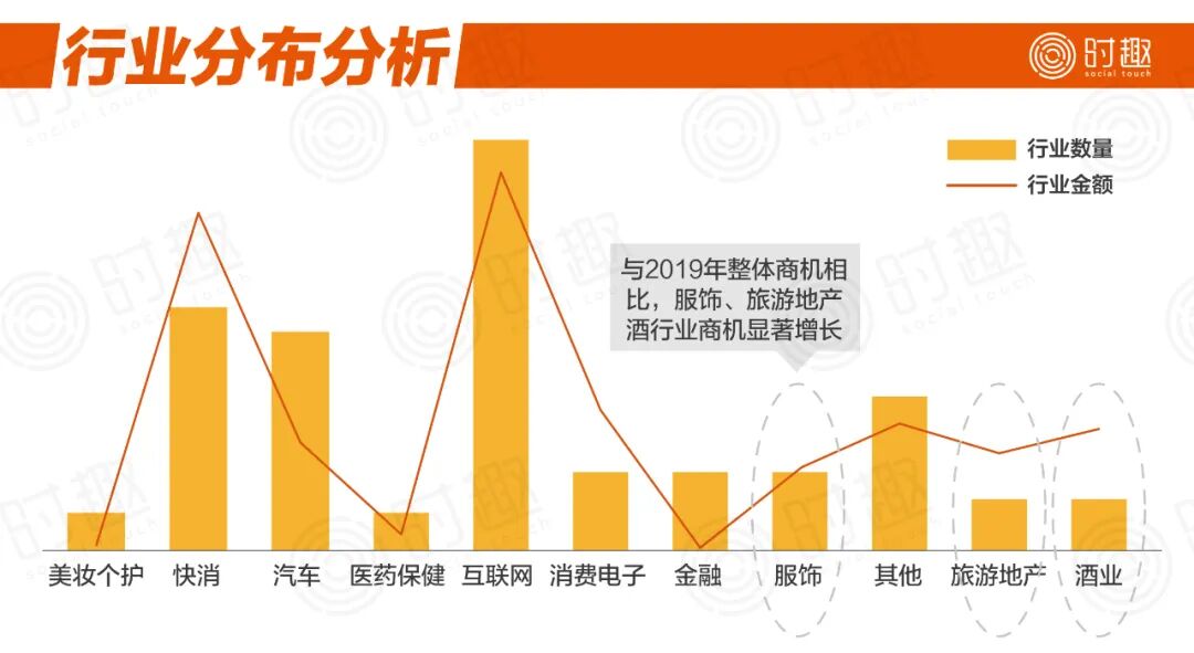 虽然有戏谑的成分在,但是不可否认的是:疫情过后,凭借人类的自愈能力,一切都会回归正轨;但是这个“正轨”,显然已经不是过去的轨道。疫情倒逼商业、营销、沟通等等“大范围”“强迫式”的在线完成,也让消费者愿意付出学习的成本去“第一次”接触新的娱乐、新的购买、新的社群、新的学习方式。——谁没有从中发现几个“真香”,然后改变了自己消费习惯呢?比如,笔者第一次开始看抖音直播,在抖音下单购物了;有人第一次尝试体感游戏,买了健身环,在家健身了;有人加入了新的社群,在线付费学习了;有人买了投影仪,发现在床上看电影的体验也不错、以后可以少去电影院;有人发现,自己2个月不买一支口红也过得不错……而改变不仅是短期。例如我买了极米的投影仪,尝试了在家看电影后,就决定以后少去电影院看电影。旁边也有朋友尝试了VIPkid的在线英语外教后,就决定以后不再上线下的外教课,只上中教课。市场怎么变?就我们自己的小例子,也能代表一个侧面:时趣诞生伊始,是在帮一些国际一线品牌进行社会化营销,通过几年的发展,我们将业务扩展为品牌整合营销服务,并且帮近200个知名品牌提供“AI+创造力”的营销服务。所以,主动来找我们的有效商机,往往是品牌寻求创新营销提升的。我们的数据显示,在这次疫情危机中,我们的业务不降反增,在2020年一季度收到的商机总金额与2019年一季度相比,同比的增幅竟然达到了300%。分析了商机来源,我们发现有几个有意思的变化:1、与2019年整体商机相比,向时趣咨询的服饰、旅游地产、酒行业的商机显著增长;在这个背后,是服装、地产、酒类这些营销和渠道模式相对传统的行业正在发生改变。在过往,这些行业往往做起数字化转型“雷声大雨点小”,习惯了长期的营销服务合作伙伴和自成体系的品牌与渠道;而2020年一季度,这些最“稳定”的传统行业也面对着变革的巨大压力,并且寻求新的营销服务合作伙伴,开始正式立项,进行实在的转型举措。甚至汽车行业——作为一个最为成熟、与合作伙伴会保持长期合作的品类,也开始寻求创新营销公司,探索用大数据与快消品的方式去做营销机会。