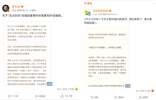 就拿最近520老罗道歉上微博热搜的事件说起,初代网红老罗,为满足广大男性粉丝520送礼需求,5月15日和花点时间交了个朋友,在直播间提前预售了花点时间520的节日鲜花,结果到了520当天,老罗微博变维权现场,老罗也为交朋友花了100多万买单。