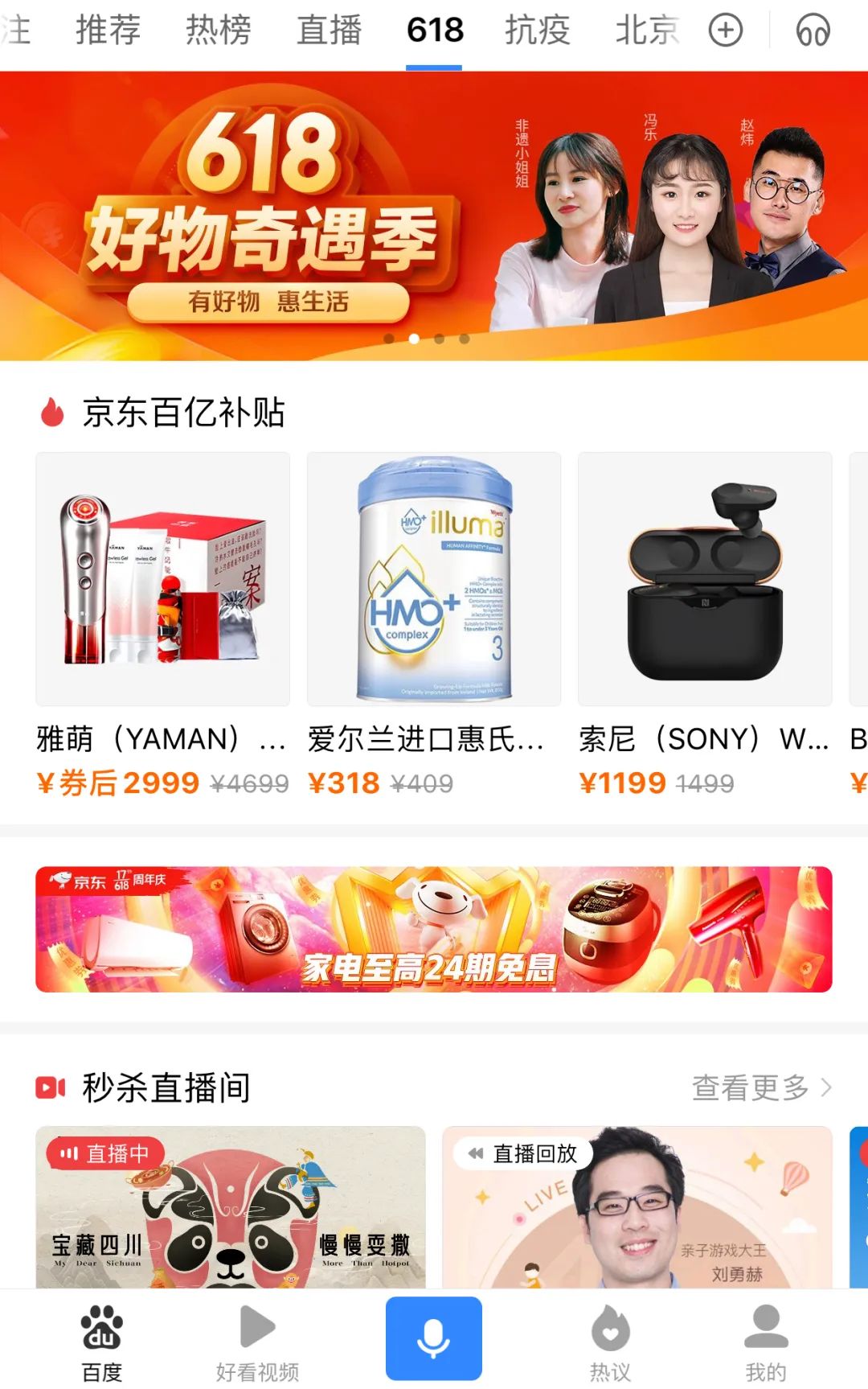 而前两天,借“618大促”的契机,百度App推出了“618”频道,正式上线直播带货模式。