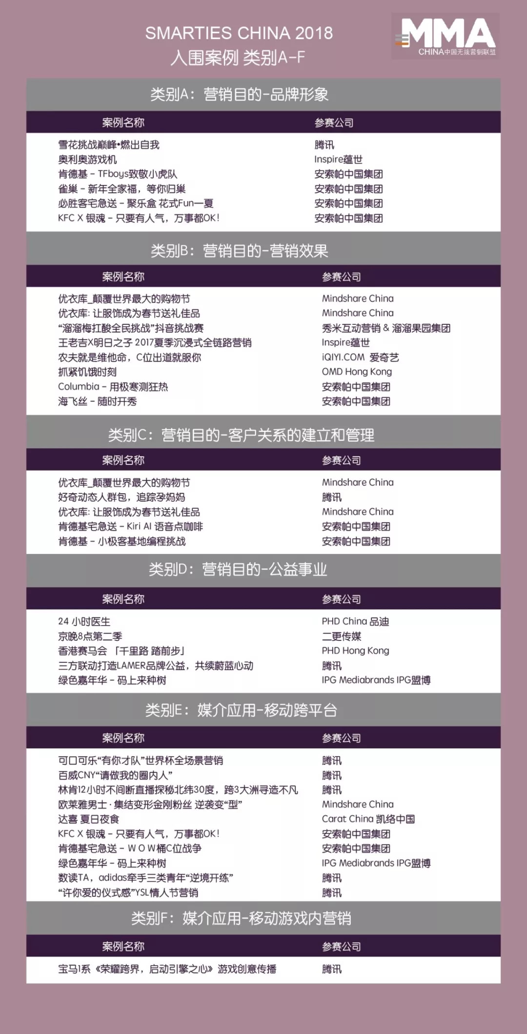 MMA中国自5月报奖征集开始以来,总共收到222份报奖案例。经过100多位由代理商、品牌主、移动营销技术公司组成的初审评判团在一周内完成线上评审,筛选了71个入围案例进入最后终审,竞逐3大类别(营销目的,媒介应用,技术应用)内12个细项的金、银、铜奖,和3个全场大奖:最佳案例、年度最佳代理商、年度最佳广告主。