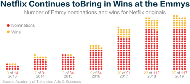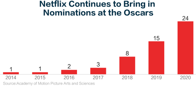 2018年,奈飞投入大概120亿美金,拍出100多部电影和200多部影视剧内容,这个发行量超出整个欧美市场影视剧公司内容的50%,比所有竞品公司作品加起来的总和还要多。同时,这些作品无论是在艾美奖、还是奥斯卡奖的提名、获奖数量也在逐年提升。这正是再说,奈飞从生产内容的数量,到内容产出的质量都提升了。