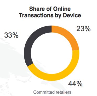 Retailers that have both mobile sites andapps are seeing, on average, two-thirds of their online sales coming frommobile devices, according to the report. In the chart below, black is desktopsales, orange is mobile web and yellow is app-based sales.