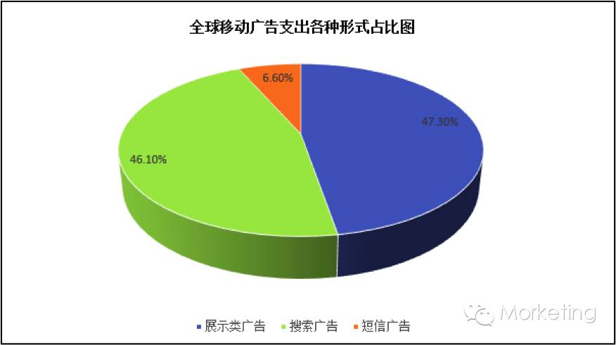 报告还依据广告形式对全球移动广告支出进行了统计,发现展示类广告比重最高,为151亿美元,占比47.3%;紧随其后的是搜索广告,金额为147亿美元,比重为46.1%;余下的21亿美元为短信广告,只占总额的6.6%,而且短信广告是所有广告形式中增速最慢的,同比增幅仅为13%。相比而言,展示类广告增速最快,同比增幅达到88.1%。