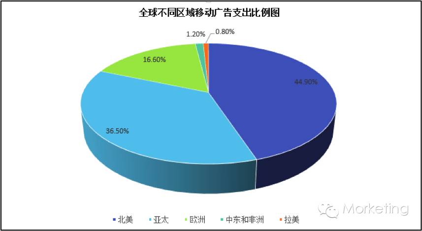 排在北美后边的是亚太地区,在移动广告方面的支出达到了116亿美元,占全球总额的36.5%;然后是欧洲地区,支出金额为53亿美元,比重为16.6%。排在第四位、第五位的地区分别是中东和非洲(3.79亿美元,1.2%)、拉美地区(2.39亿美元,0.8%),虽然这两个地区移动广告支出的总金额和排在前三名相比,差距很大,但是它们增速很快,同比增幅分别达到68.5%和66.1%,成为全球移动广告支持增长速度第二快和第三快的区域。