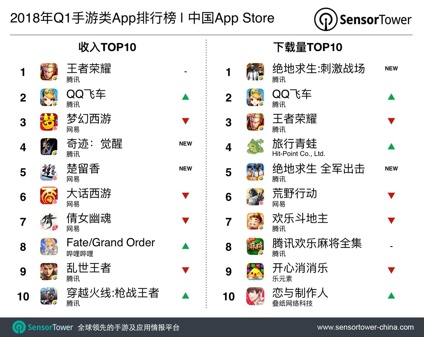 从下载量角度看来,腾讯再次成为赢家。春节档高调上线的吃鸡巨作《绝地求生:刺激战场》优势绝对,夺得上季度iOS手游下载量第一,全国玩家爱不释手。而另一部吃鸡巨作《绝地求生 全军出击》则排名第五。《王者荣耀》虽排名相对于2017年Q4下降两位,但依旧保持前三。