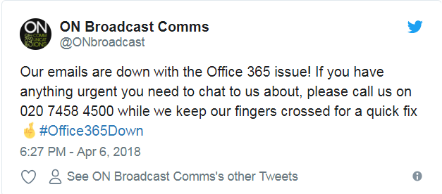 我们的电子邮件系统因Office 365问题而瘫痪了!如果您有任何紧急的内容需要与我们联系,请拔打电话020 7458 4500给我们,但愿微软迅速拿出解决方案。